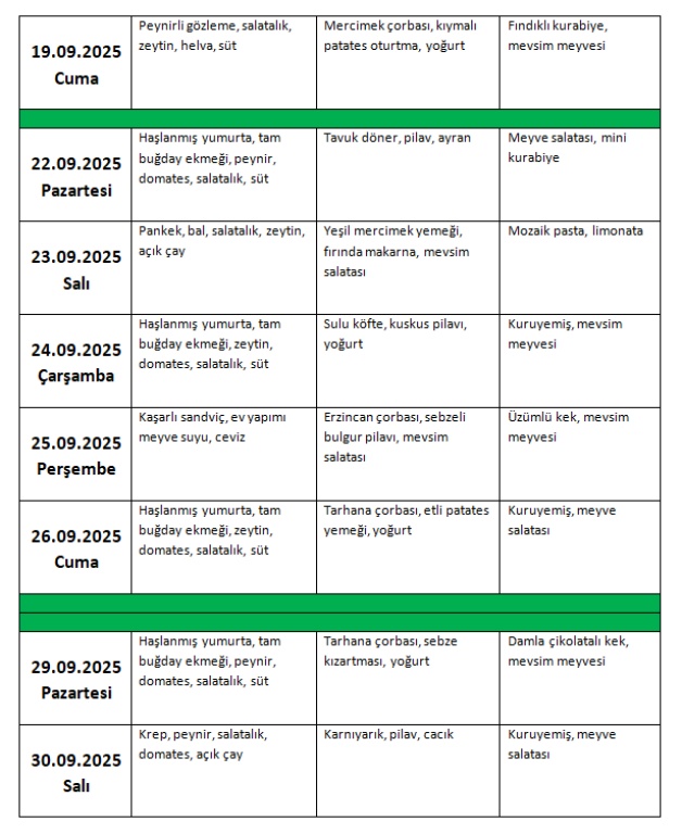 EYLÜL AYI KULÜP SINIFI BESLENME LİSTESİ